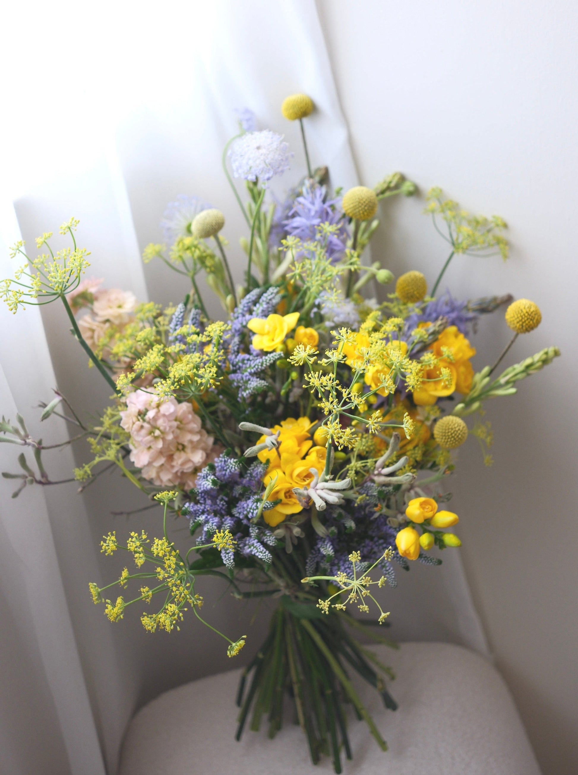 Seasonal wildflower mix in bright pastels (~13 - 14" diameter). A cheerful burst of colours, textures and happy vibes for the curious and free-spirited soul!