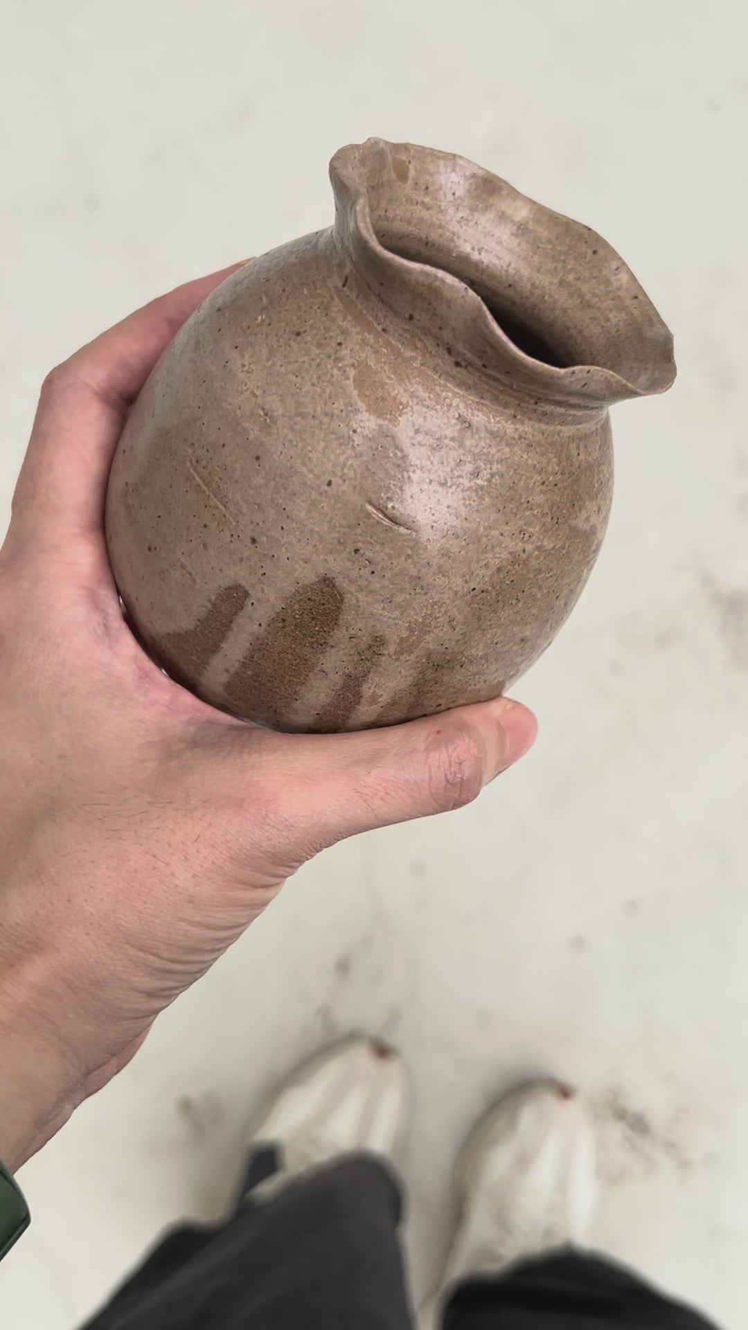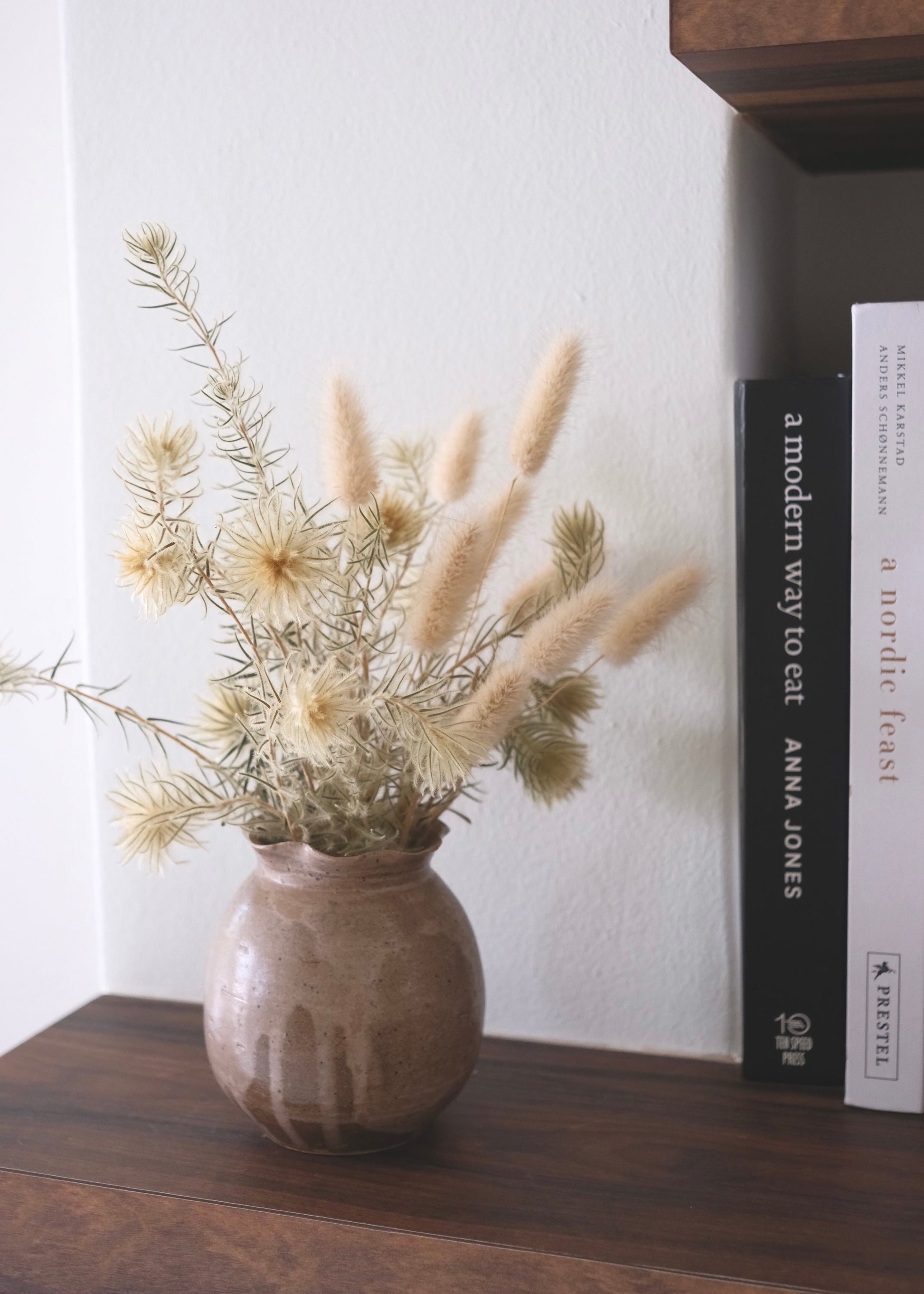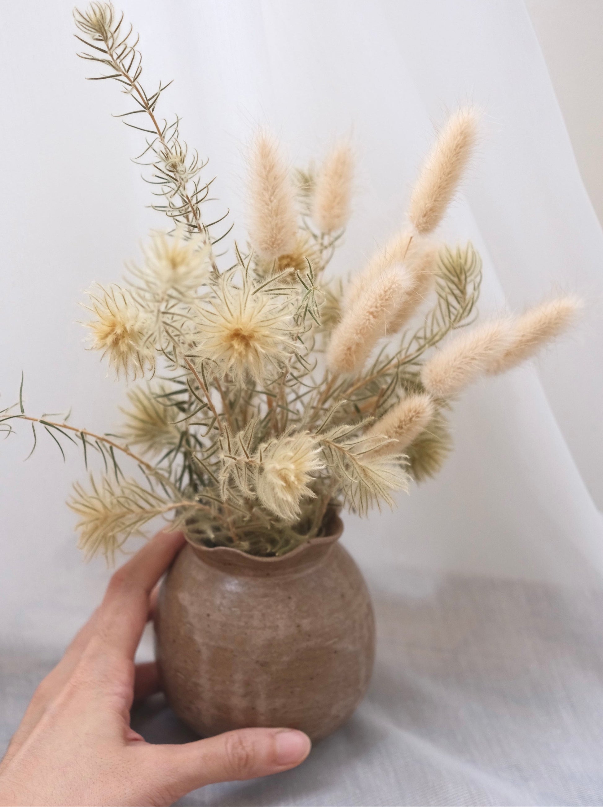 Dried wildflower arrangement of phylica and bunny tails, extending towards the light like curious explorers. Comes in an earthy vase with a dainty frilly collar and organic layers of dripped glaze - beauty, immortalised.